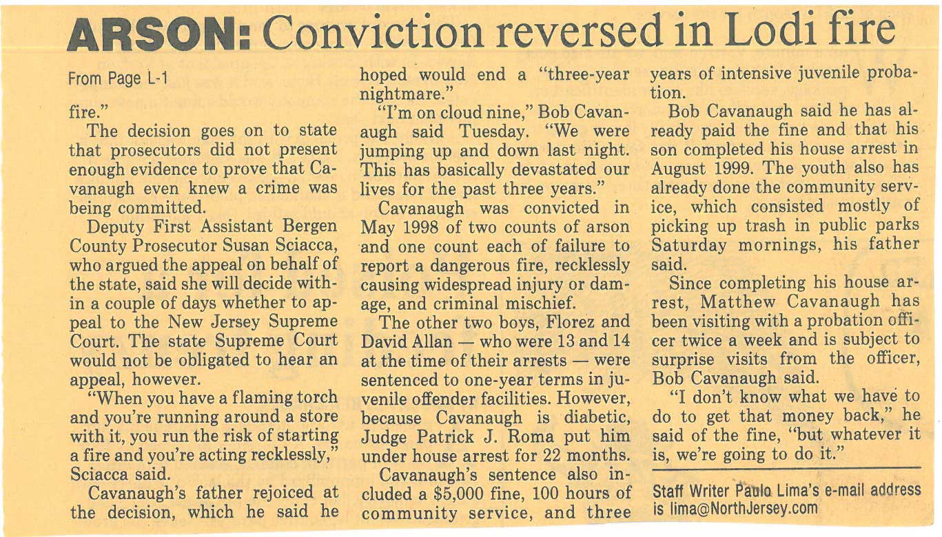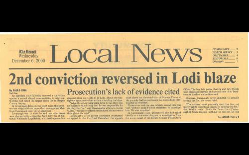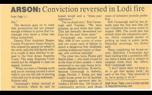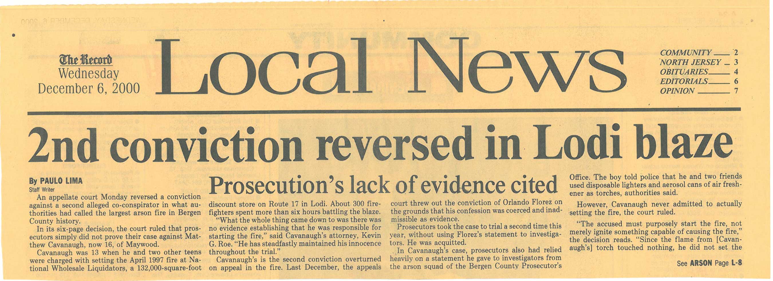 On December 5, 2000, the Superior Court of New Jersey, Appellate Division, reversed the conviction of Matthew Cavanaugh who had been convicted of arson in connection with a massive fire at the National Wholesale Liquidators in Lodi, New Jersey in the Bergen County Superior Court.